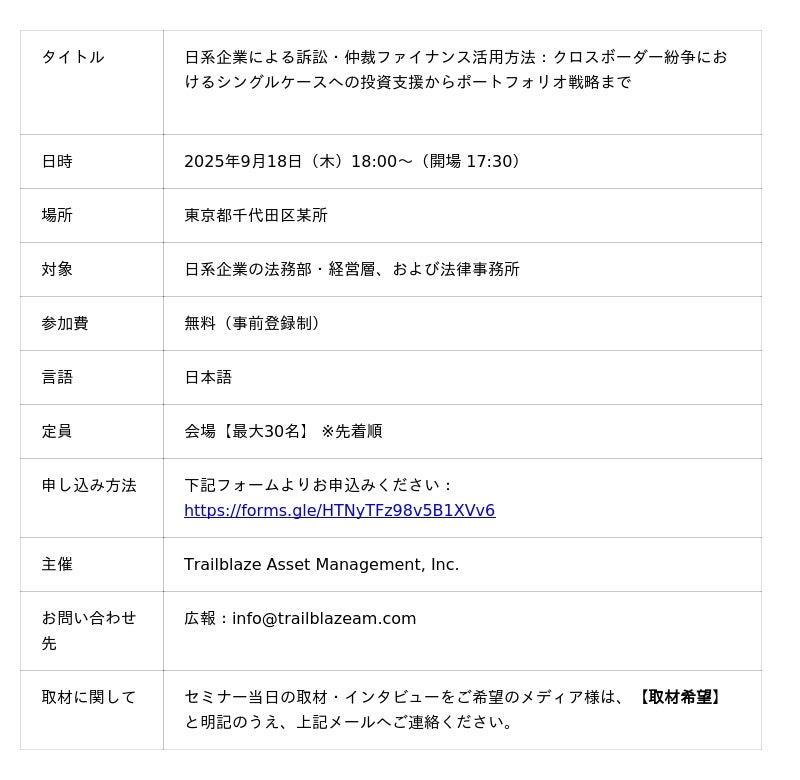 Trailblaze Asset Managementは、日系企業の法務部・経営層および法律事務所を対象に、「国際訴訟・仲裁における訴訟・仲裁ファイナンスの実務活用」を解説するセミナーを開催します。
