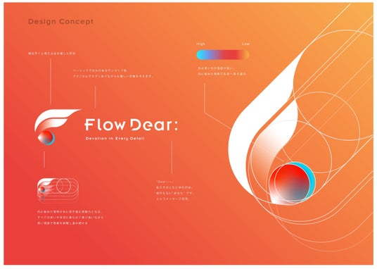 ロゴのシンボルは、頭文字Fと燃える炎を模した形状になっており、炎は青い方が温度が高く、青色も入れ込むことによって、内に秘めた情熱が先に突き進む原動力を表現しています。すべての想いや状況に柔らかく寄り添いながら高い視座で物事を俯瞰し進み続ける、FlowDearらしさを表しました。