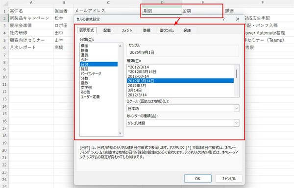 このリストの「期限」と「金額」の項目には、「セルの書式設定」が適用されています。日付や金額を分かりやすくするために、期限は「2025年9月15日」といった書式で、金額は「\」マークや「,」の桁区切りが付く書式で、それぞれ表示させています。