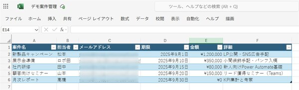 今回は、Excelファイルのサンプルリストに記載された案件について、その担当者にメールとメンション付きTeams投稿で通知を行うクラウドフローを作ります。