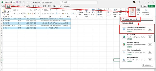 ExcelからPower Automateのクラウドフローを起動するためには、まず「Power Automateアドイン」の追加が必須です。「アドイン」ボタンを押し、検索窓に「Power Automate」と入力して、Power Automateのアドインを追加します。