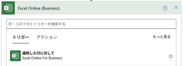 今回のフローはExcelから起動させるので、「Excel Online(Business)」コネクタの「選択した行に対して」トリガーをクリックします。