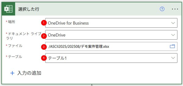 このトリガーは、実行時にExcel上で選択されているデータを読み込んだうえで、フローの処理を実行するものです。次のように設定して、データの読み取り対象とするExcelファイルおよびテーブルを指定します。
