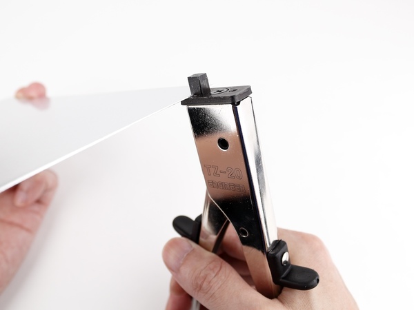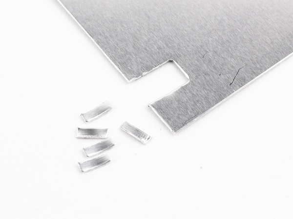 試しに、手元にあった約0.5mmのアルミ板をカットしてみました。切りたい部分を刃の下に滑り込ませてハンドルを引くと、約2mm切り取られます。これを真っ直ぐ繰り返せば直線切りになりますし、少しずつ角度をずらして繰り返せば、曲線切りになります。