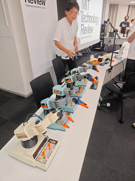 アームトロン。いまも世界最先端のAIロボティクスの関係者がほぼ《神》のようにあがめる機構的絶対到達点にある変態ガジェット。MITテクノロジーレビュー日本版のイベントにて(立っているのは開発者の渡辺広幸氏)。