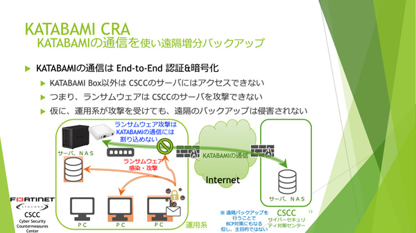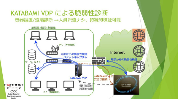 ITシステム脆弱性診断/分析サービスは、SYNCHROが独自開発する暗号化通信(VPN)デバイス「KATABAMI(カタバミ)シリーズ」を用いて、SYNCHROのCSCCから遠隔で、顧客組織内にあるIT資産の継続的な脆弱性診断などを行うもの。顧客拠点への人員派遣をなくすことで、低価格化を図っている。サイバー保険(あいおいニッセイ同和損保「サイバーセキュリティ保険」)の付帯も可能だ。