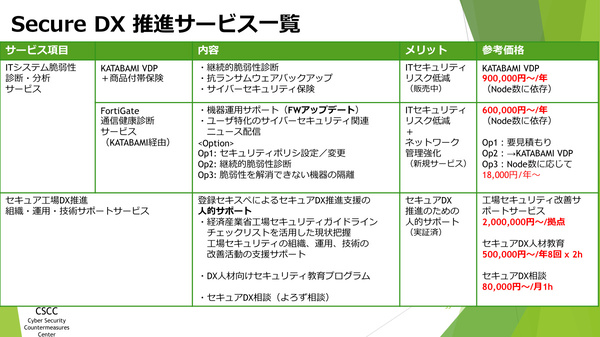 Yamaguchi Secure DX Coreの中で提供される「Secure DX推進サービス」には、「ITシステム脆弱性診断/分析サービス」と「セキュア工場DX推進 組織/運用/技術サポートサービス」がラインアップされている。