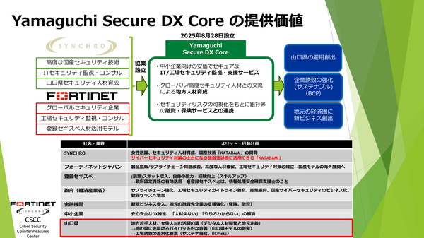 サイバーセキュリティベンダーのフォーティネットジャパンと、物理/サイバー両面のセキュリティソリューションを展開するSYNCHROが、2025年8月28日、両社アライアンスによる新プロジェクト「Yamaguchi Secure DX Core」の開始を発表した。
