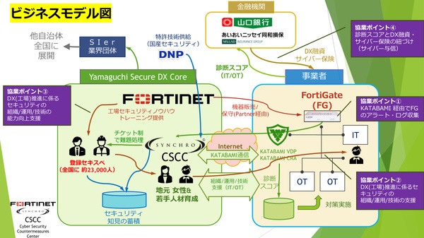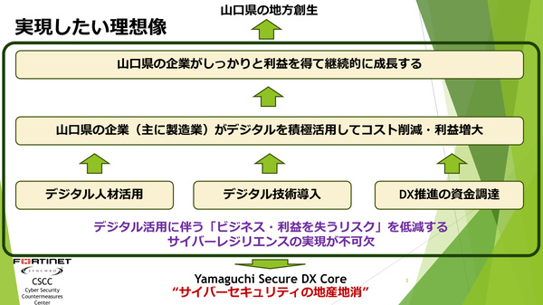 もうひとつ、Yamaguchi Secure DX Coreでは、地銀などの金融機関との連携も考えている。デジタル活用/DXに取り組む地元企業が、同時にIT/OTセキュリティ強化も進める“Secure DX”を実行し、十分なセキュリティ対策が行われていることを客観的に証明する診断スコアを金融機関に提出することで、DX融資が受けやすくなるという考えだ。