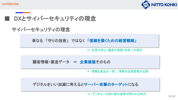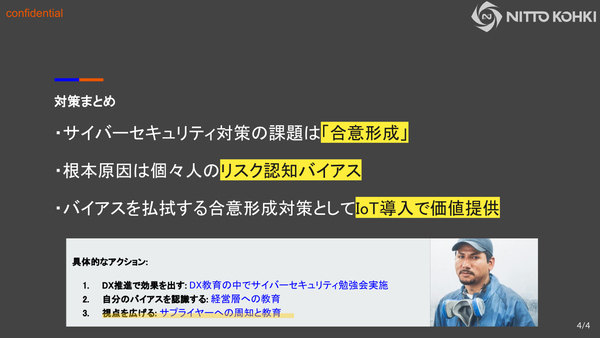 部品製造業の栃木日東工器では、DXの推進にセキュリティは欠かせない要素と考え、協力会社も含めたセキュリティ意識/対応力強化に取り組んでいる。工場でセキュリティ対策が進まない原因を「合意形成」として、DXで成果を出しながらセキュリティを推進する必要があると述べた