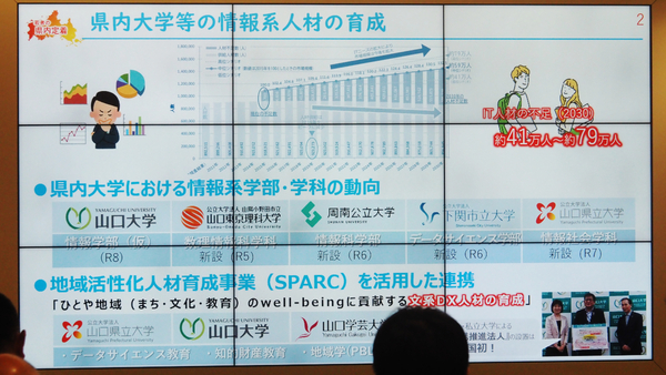 前述したとおり、山口県内にある大学では近年、情報系学部/学科の新設が相次いでいる。その結果、2030年(令和12年)には、500名を超える情報系人材が学部/学科卒業する見込みだ。一方で、県内の情報サービス業の事業所数はおよそ260件(2023年時点)と少なく、その賃金水準も大都市圏には及ばない。こうしたことから「県外就職が拡大するおそれがある」と危機感をつのらせる。