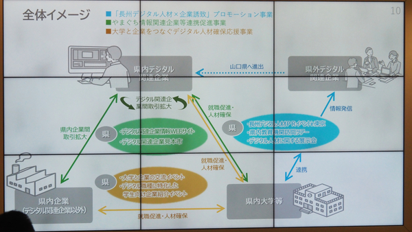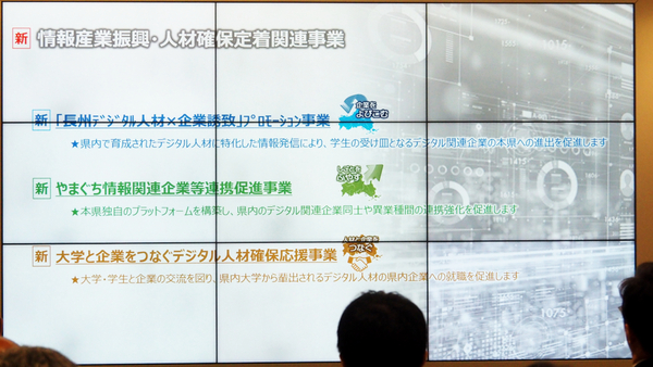 1つめは、情報/デジタル関連企業を山口県に誘致する事業で、山口県の優秀なデジタル人材を大都市圏の企業にPRし、山口県への訪問ツアーも実施して、地方拠点開設を促す。2つめは、県内のデジタル関連企業と異業種を含む他企業との連携を促進する事業で、デジタル関連企業の実績、得意分野などを紹介するWebサイトの公開、見本市の開催などを行う。3つめは、県内の情報系学部/学科に所属する大学生と企業の交流を進めて県内就職を促進する事業で、大学と企業の交流イベント、情報系学生向けのデジタル職種特化イベントを開催する。