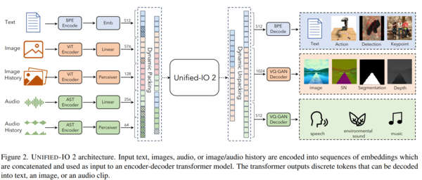 2023年12月に発表された米アレン人工知能研究所が中心になって実施した研究「Unified-IO 2: 視覚・言語・音声・動作を統合した自己回帰型マルチモーダルモデルの拡張」では、any-to-anyモデルである「Unified-IO 2」が、テキスト、画像、画像の変化過程、オーディオ、オーディオの変化過程といった情報を入力することで、様々なバリエーションのあるデータを出力できるようになると説明されています。