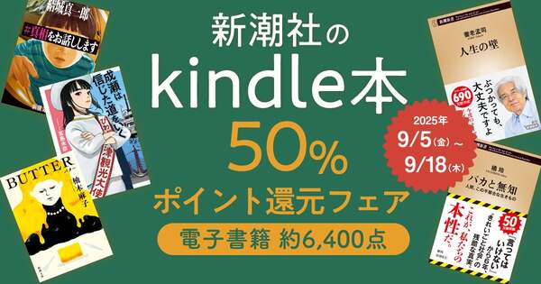 新潮社は9月5日正午、AmazonのKindleストアで同社の電子書籍およそ6400点を対象に、購入額の50%分をポイントで戻すキャンペーンを開始したと発表した。期間は日本時間の9月5日0時00分から9月18日23時59分までの14日間。文芸、ノンフィクション、新潮新書・選書、コミックエッセイなど「文字もの」の電子版が中心で、フェア会場はAmazon内の特設ページに用意されている。