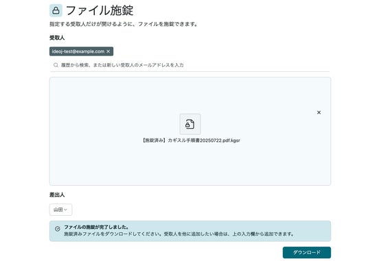 「カギスル」は、共有相手のメールアドレスを入力するだけで、その相手だけが閲覧できる暗号化ファイルを作成できるサービスです。パスワード付きZIPに代わる、安全で利便性の高いファイル共有手段を提供します。