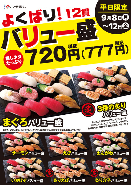 持ち帰りすしの「小僧寿し」では9月8日~12日の期間限定で「よくばり!バリュー盛フェア」を開催し、「バリュー盛」各種を販売します。