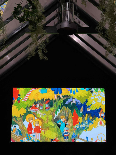 junaida氏のアニメーションは、細密な絵が動いてるのが珍しい。小屋の中の空間もjunaidaさんがディレクションしている。ヘッドホンをつけて、小屋に入って、空気を感じて、クスノキの声に耳を傾ける、という体験ができる。