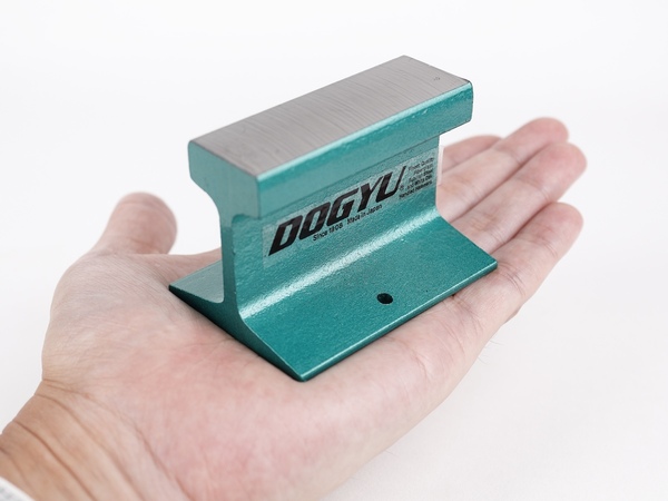 こういった目的にちょうどいいのが100mmサイズの「金床」。実測約100(幅)×120(奥行き)×115(高さ)mmで、重量約3300gという製品です。ミニレールアンビルと比べると、重量比で8倍以上、作業面の広さも3倍以上と、かなり大きくなっています。