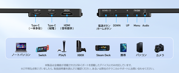 このモバイルモニターはUSB Type-CとDisplayPort端子を搭載しており、PC、MacBook、スマートフォン、Nintendo Switch、PS5など様々なデバイスとスムーズに接続できる。ケーブル1本で電源供給も可能なのが嬉しいポイントだ。