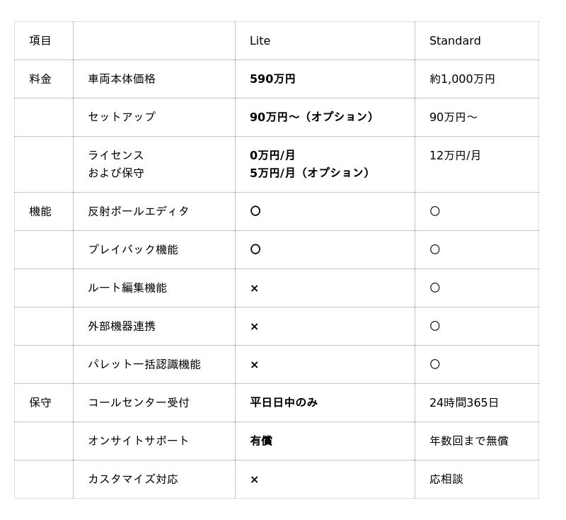 従来モデルの約60%のコストで導入が可能。自動搬送の核となる機能に絞り込み、590万円から導入できます。お客様自身によるセットアップにも対応し、本体価格のみでの導入も可能です。