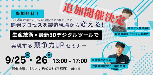 オリオン株式会社(本社:京都市中京区)は、8月26日に実施した実演型セミナーの好評を受け、同内容の追加開催を9月25日(木)・26日(金)各13:00~17:00に決定しました。会場は自社内「olabol(オラボル)」。当日は、セミナー時間内で“1から成形型を作成→組付け→射出成形”を通しで実演し、参加者にはその場でできた成形サンプルをお渡しします。