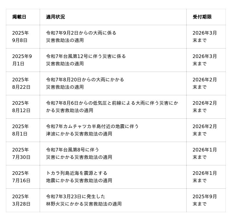 ※申込時の備考、またはその他の連絡事項欄に「令和7年9月2日からの大雨」と対象の災害名を記載してください。