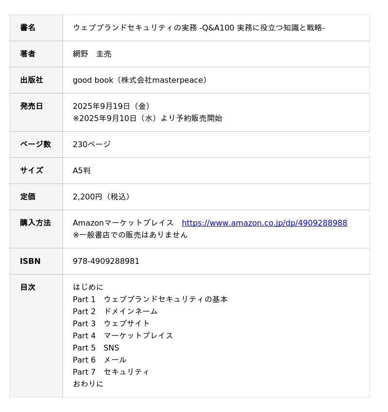 GMOインターネットグループで、なりすまし監視・削除支援(ブランドセキュリティ)サービスを展開するGMOブランドセキュリティ株式会社(代表取締役社長:中川 光昭、以下「GMOブランドセキュリティ」)は、デジタル時代の喫緊の課題であるウェブブランドセキュリティに関するトレンドや実務的な知識をQ&A形式でわかりやすく網羅した新刊『ウェブブランドセキュリティの実務 ‐Q&A100 実務に役立つ知識と戦略‐』を2025年9月10日(水)より、Amazonにて予約販売を開始し、2025年9月19日(金)より販売いたします。
