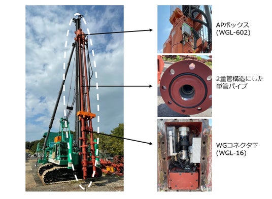 本システムは、地盤改良工事における深層混合処理工法※1において、従来は困難であった地中の掘削ロッド先端位置をリアルタイムで計測・表示することで、高精度な鉛直精度※2の管理を実現します。2軸深層混合処理機において、掘削ロッドの中心に設置したウェーブガイドLANを介して、掘削部付近に配置されたジャイロセンサーと施工管理用PCを接続します。これにより、深度情報と連携して先端位置をリアルタイムでの表示が可能となります。リアルタイムで表示した先端位置を施工に反映することで、鉛直精度の高い高品質な改良体の構築を実現する他、単管パイプを耐圧管で保護する2重管構造を採用することで地中でも安定した無線通信を可能にしました。これまでウェーブガイドLANは、建設現場など電波が入り辛い 高層階や地下階、エレベーター内において無線LAN環境の構築に貢献してきました。このたび竹中土木と共同で本技術を応用したことで、地盤改良工事の品質向上および信頼性確保への貢献にも期待できます。