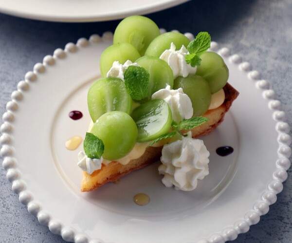 新谷農園のシャインマスカットを使用した季節限定のタルトです。タルト生地と自家製アーモンド生地に、甘さと張りのある果実を重ね、2種類のオリジナル葡萄ソースと合わせて食べる仕立てです。風味付けにアルコールを少量使用しています。