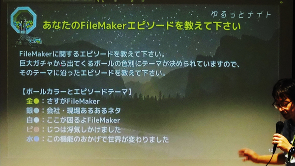 この日のメインコンテンツは、FileMakerにまつわる「エピソードトークガチャ」でした。冒頭に写真を載せた巨大ガラポンは、このために用意されたもの。皆さんがその場で1回ずつガラポンを回し、出たボールの色で話すテーマ(5種類)が決まるルールです。なので皆さん、前準備なしの“ぶっつけトーク”です。