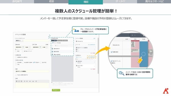 予定の作成時には、グループメンバーを一括登録でき、メンバーや会議室を横断した空き時間も、視覚的に表示してくれる。