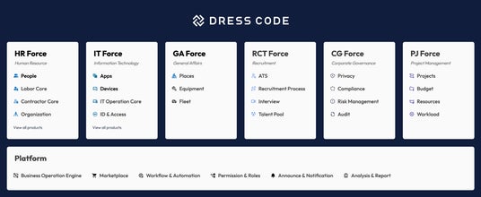 「DRESS CODE」は、人と業務に関する構造的な摩擦を解消する、ワークフォースマネジメントプラットフォームです。企業内の人事・情報システム・総務など“人”に関わる業務は、部門ごとにツールや台帳、プロセスが異なり、属人化・重複作業・情報の分断といった非効率が常態化しています。こうした“摩擦”を抜本的に見直し、業務を横断的・持続的に最適化するために生まれました。