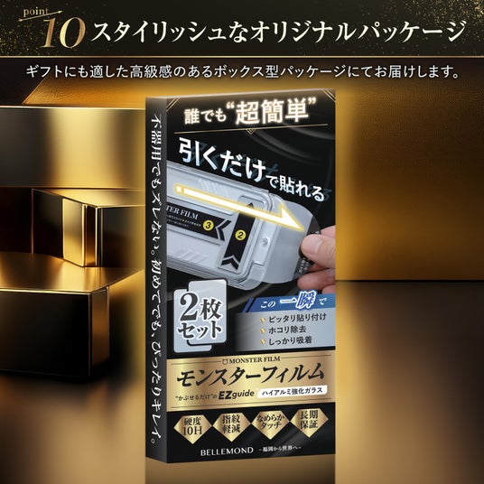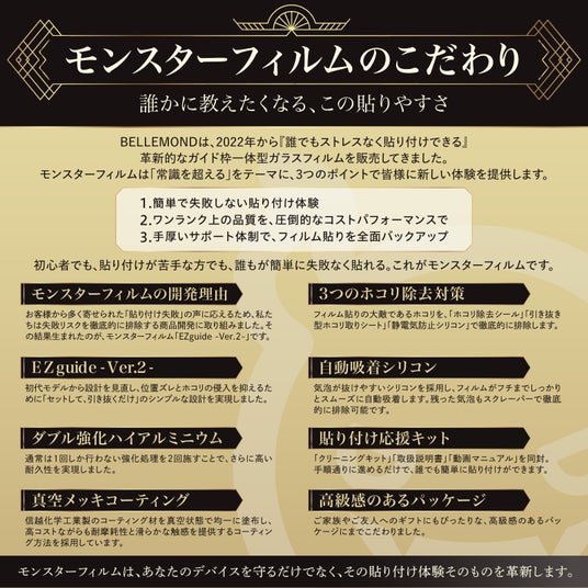 フィルム販売実績多数のBELLEMONDが提供する『モンスターフィルム』は、卓越した性能と優れたコストパフォーマンスを誇る強化ガラスフィルムです。