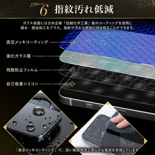 ガラス表面には日本企業「信越化学工業」製のコーティングを使用し、撥水・撥油加工をプラス。指紋や汚れも簡単に拭き取ることができます。