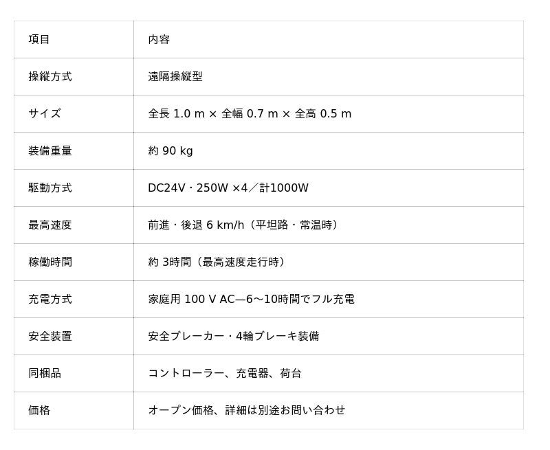 高出力・4モーター駆動で不整地も突破独立4モーターによるAWD構成(合計1000W) で、強力なトラクションを発揮、不整地や斜面も安定走行。 電動駆動により静音性が高く、低コストで運用可能です。ガソリンやオイル不要でメンテナンスフリー。CO2 排出ゼロのため、室内や閉空間でも使用できます。
