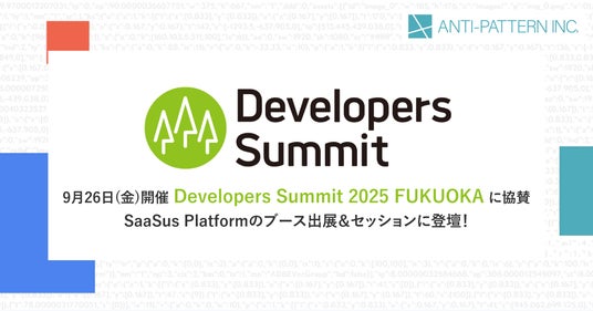 「日本のソフトウェアエンジニアを憧れの職業へ」を理念に掲げる株式会社アンチパターン(本社:東京都港区、代表取締役 小笹 佑京、以下当社)は、株式会社翔泳社が主催する「Developers Summit 2025 FUKUOKA」にランチスポンサー及び展示ブーススポンサーとして協賛し、代表 小笹のセッション登壇及び、BtoB SaaS 開発/運用/販売を支援する「SaaSus Platform」でブース出展することをお知らせします。