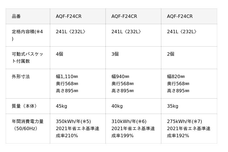 ※3:「クイック冷凍」に設定時のみ。クイック冷凍運転中は、消費電力量がAQF-F17CR:約193%、