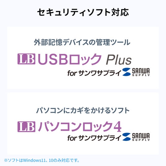USBメモリなどのUSB接続ストレージの使用をコントロールできるセキュリティソフト「LB USBロックPlus」に対応しており、使用を許可するストレージを制限したり、読み取り専用設定をしたりなど、外部機器からのアクセスをコントロールできます。