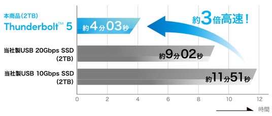 また、従来のUSB 10Gbps対応SSDと比べてファイル転送時間は約3倍に短縮しました。