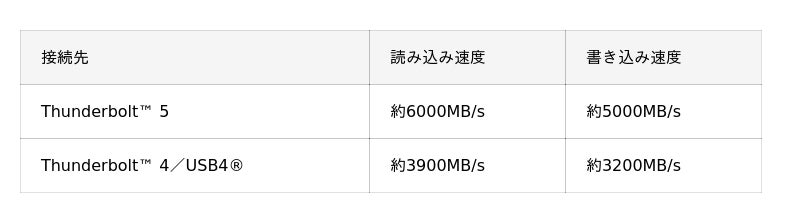 ・特長1.-Thunderbolt(TM) 5接続&高性能SSD採用でRead最大6000MB/s Write最大5000MB/sの超高速転送