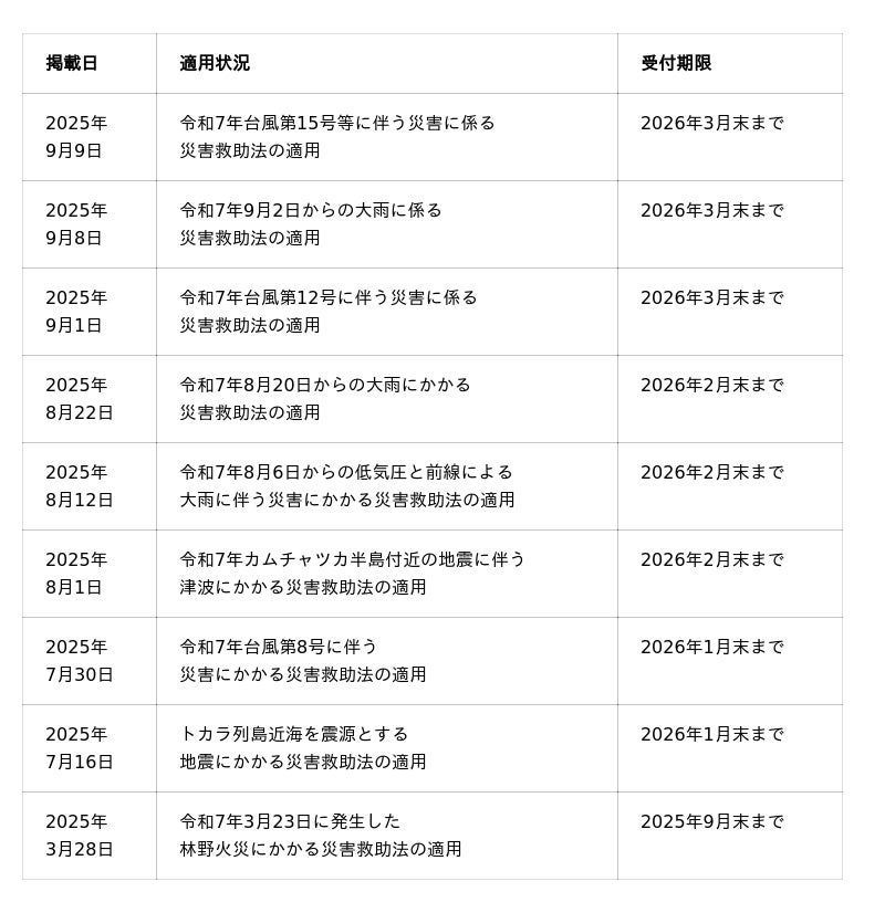 ※災害救助法適用地域の最新情報は内閣府のホームページにてご確認ください。