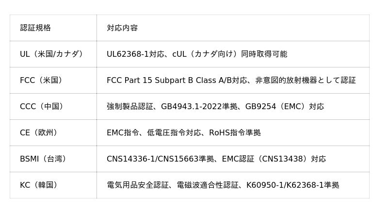 本サービスは、画像検査装置や半導体製造設備などの高性能産業機器に搭載されるカスタム産業用コンピューターの開発から、各国の安全規格認証取得までを大手の認証機関との提携によりワンストップで支援します。対応認証はUL(米国/カナダ)、FCC(米国)、CCC(中国)、CE(欧州)、BSMI(台湾)、KC(韓国)等、主要市場の規格を網羅しています。