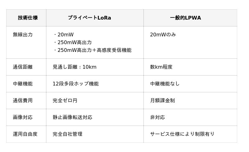 当社のプライベートLoRaは、超高出力技術をベースに従来技術の限界を大幅に突破する性能を実現しています。技適取得済み高出力と高感度受信により通信エリアの拡大を実現。12段多段ホップ機能で山間部の複雑な地形にも柔軟に対応し、一般的なLPWAを大幅に上回る性能を達成しました。