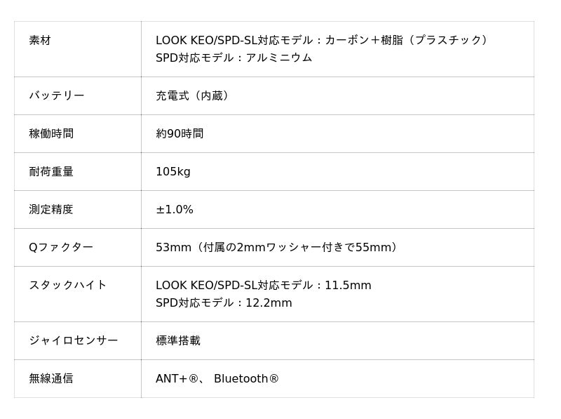 ・計測センサーがスピンドルに内蔵されており、デザイン性の向上と、落車時等の破損リスクを軽減。