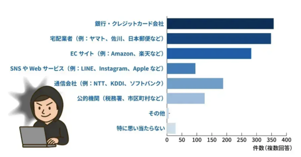 銀行・クレジットカード会社、宅配業者、ECサイト、通信会社、公的機関、SNSやWebサービスの順に回答数が多い(出典:GMOブランドセキュリティ)