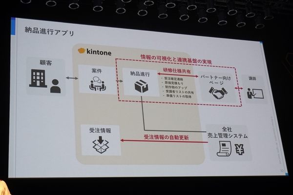 まずは、研修の受注から納品までの進行状況を一元管理する「納品進行」アプリを作成。いつどこで何の研修を実施するのかといった情報やテキストファイルなどを集約し、担当者以外でも状況を把握できるようにした。そして、この納品進行アプリの情報を、kintoneアカウントを持たない外部パートナーと共有するために「じぶんページ」のプラグインを活用している。