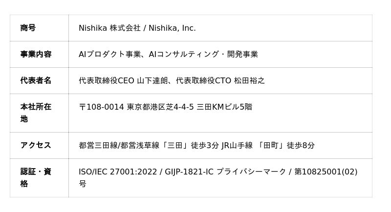 Nishikaは「テクノロジーですべての人が誇りを持てる社会を」をビジョンに掲げ、企業の生産性を高める新たなデータ資産創出に取り組んでいます 。 中でも、SecureMemo/SecureMemoCloudを通じて「企業の会議を全てデータ化する」ことをプロダクトビジョンとしており、日本のビジネス会議における会話情報を精度高く記録・構造化することで、付加価値の高い情報活用を実現することを目指しています。