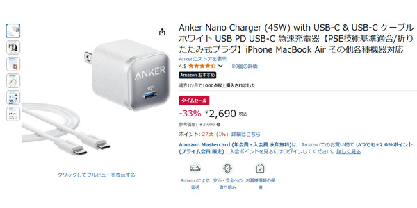 モバイル充電ブランド「ANKER(アンカー)」の急速充電器「Anker Nano Charger (45W) with USB-C&USB-Cケーブル」が、Amazonタイムセールにて販売中です。
