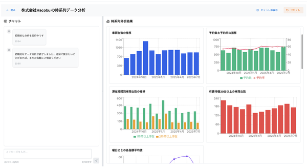 今回発表した「データ分析エージェント for MOVO Berth」は、「MOVO Berth」に蓄積された予約・入退場・滞在データを活用して、自然言語での問いかけを通じ、「主要KPIの即時可視化」、「課題の抽出」、「施策候補の提案」、「報告書の自動生成」を行うという。