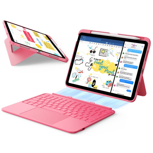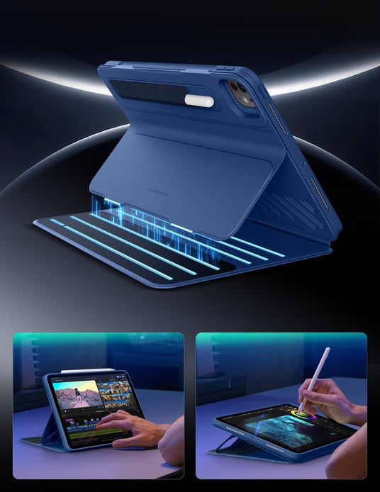 iPadをまるでノートパソコンのように活用できるキーボード付きケースです。最大の特長は、磁石で簡単に着脱できるキーボード設計。リモートワークや外出先での作業、ソファでの動画視聴や手書き入力など、シーンに合わせて自在にスタイルを切り替えることができます。また、安定した三角形スタンド構造により、65度・20度の2段階角度調整が可能。イラスト作成やオフィス作業など用途に応じた最適な視聴体験を提供します。さらに、従来より65%広くなったタッチパッドにより操作性が大幅に向上。軽量で持ち運びやすいデザインながら、エアガード・コーナーによる耐衝撃設計で、保護性能も充実しています。